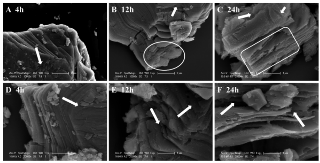 圖4. (A−C)采用IL-PF6-C6-Ms在30℃pH 0.3條件下制備的MXenes, (D−F)采用IL-BF4-C6-Ms在30℃pH 0.3條件下制備的MXenes,蝕刻時間分別為4、12和24 h的SEM圖像。