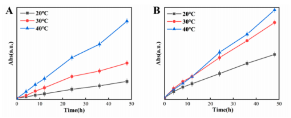 圖5 溫度對(A) IL-PF6-C4-Ms和(B) MXenes反應過程的影響。