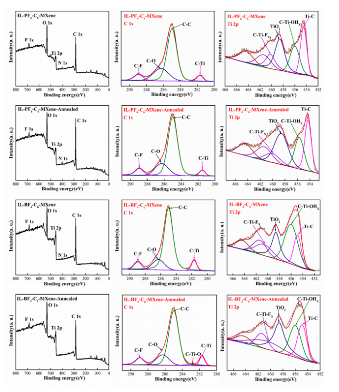 圖8。通過IL-PF6-C6-Ms或IL-BF4-C6-Ms制備的MXenes退火前后的XPS光譜。