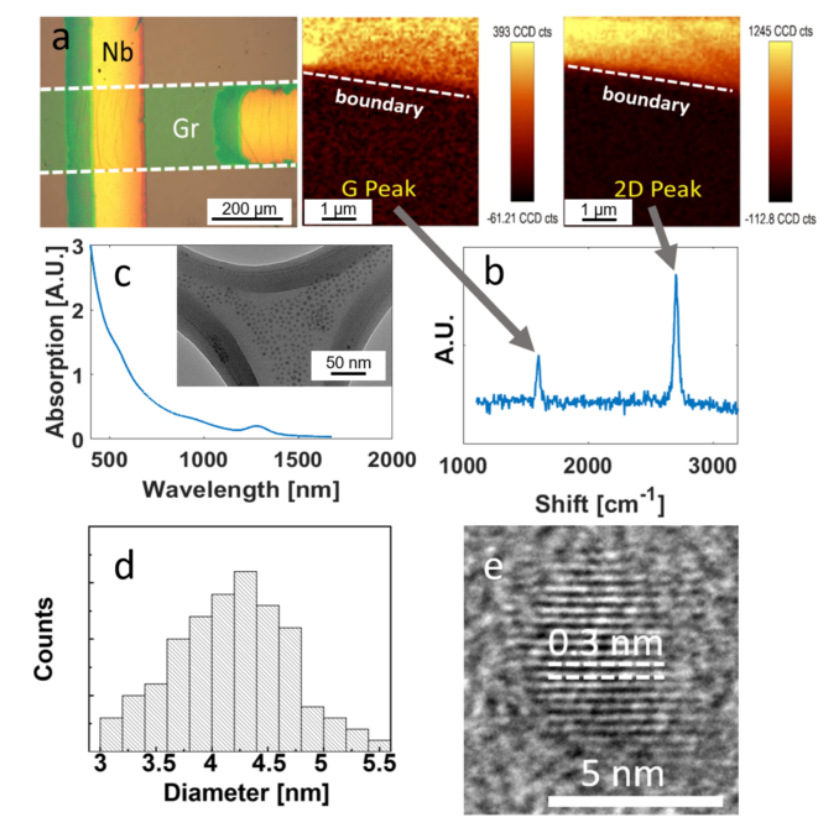 圖2。(a)在量子點沉積之前,在九通道 PbS 量子點/石墨烯傳感器陣列上的石墨烯或“ Gr”通道的光學(xué)圖像。(b)石墨烯/Si 和 Si 之間邊界處的 G 峰(左上)和2D 峰(右上)的拉曼圖,以及石墨烯上隨機選擇的點的拉曼光譜。單層石墨烯的 I