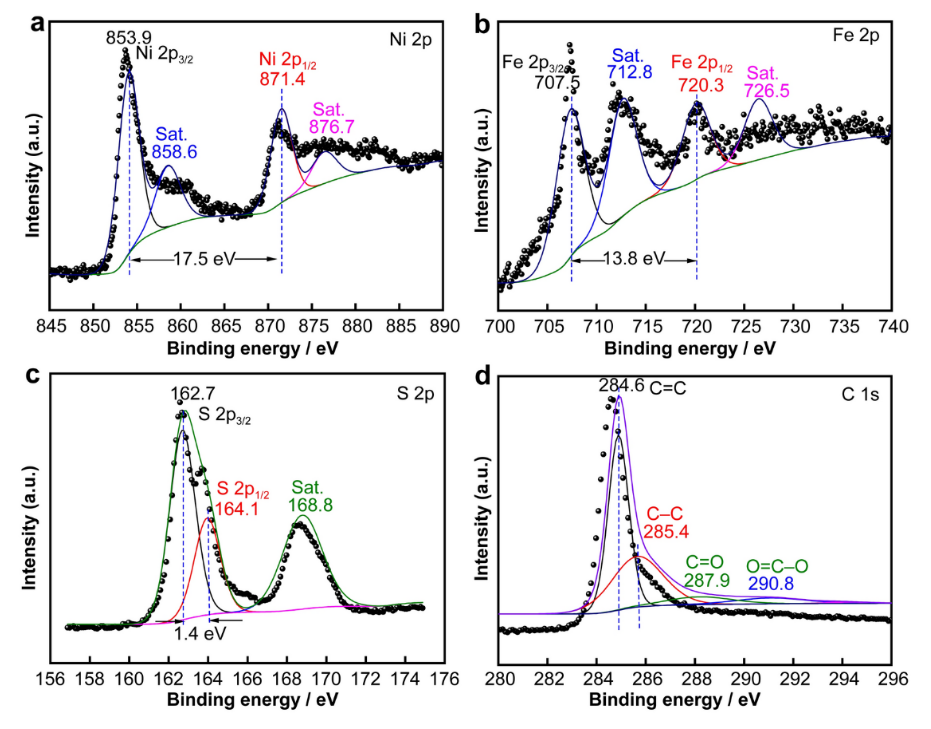 2/rGO-20%樣品的(a) Ni 2p、(b) Fe 2p、(c) S 2p和(d) C 1s的XPS譜