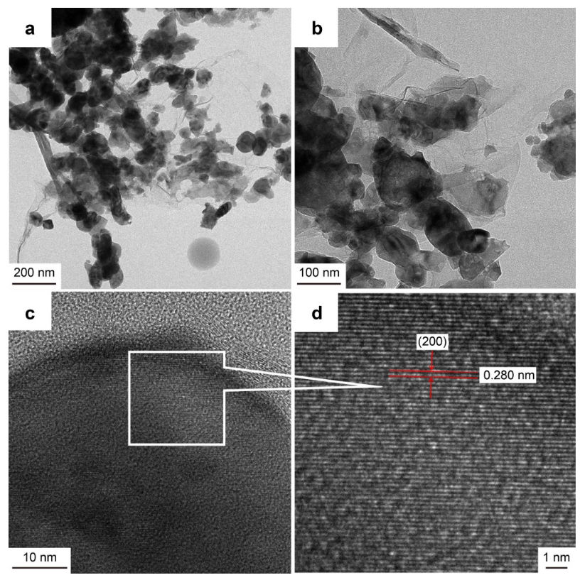 2/rGO-20%的(a, b)TEM和(c, d) HRTEM圖像。