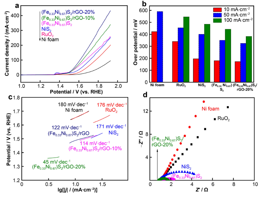 2/rGO-20%電催化劑的過電壓僅為172 mV,塔菲爾斜率為45 mV·decade