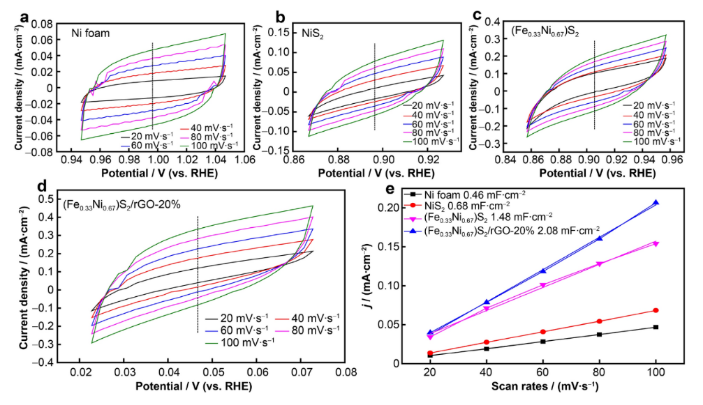 2/rGO-20%/NF的CV曲線;(e)對應催化劑的電化學雙層電容(C