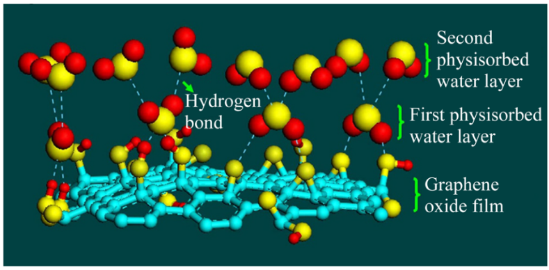 圖1. 氧化石墨烯薄膜吸附水蒸氣示意圖。水分子在氧化石墨烯膜上的吸附可分為兩個過程。第一層水分子通過兩個氫鍵附著在GO膜上。從第二層開始,水分子只通過一個氫鍵被吸附。