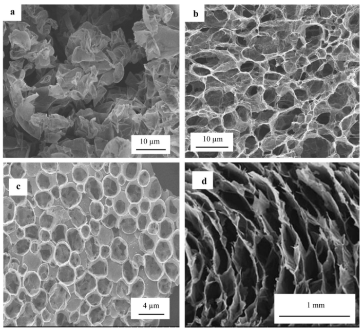 圖2. 不同形貌的三維石墨烯SEM圖像。(a)褶皺石墨烯。(b)石墨烯泡沫。(c)石墨烯氣凝膠。(d)石墨烯海綿。
