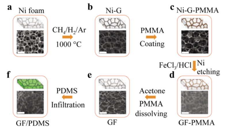 圖4. 模板輔助合成石墨烯泡沫(GF)和集成聚二甲基硅氧烷(PDMS)示意圖。使用鎳泡沫 (Ni泡沫,