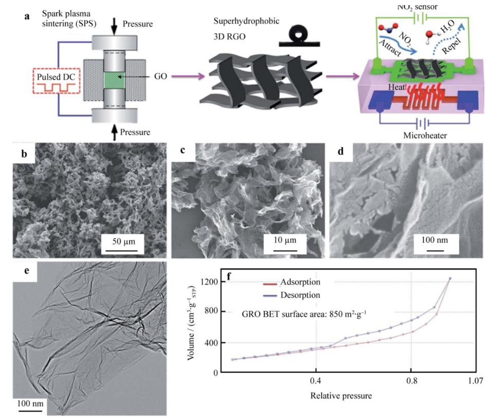 2傳感的3D超疏水RGO制造步驟。第一步,通過SPS用氧化石墨烯制備3D超疏水RGO,然后沉積在數字間電極上進行NO