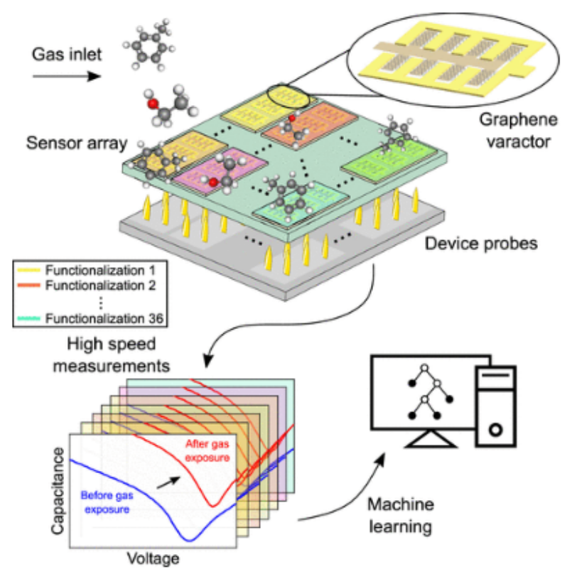 圖1. 傳感器陣列系統(tǒng)示意圖。氣體分子流過傳感陣列,該陣列包含120個傳感器,這些傳感器由36個化學(xué)受體功能化(由不同顏色的變?nèi)荻O管組表示)。上插圖顯示了一個變?nèi)荻O管的示意圖。這些器件通過電線連接到印刷電路板上,并從下面進(jìn)行探測。高速電路快速掃描每個變?nèi)荻O管的電壓−1.5和+1.5V,同時記錄它們的電容響應(yīng)。每個變?nèi)荻O管產(chǎn)生電容-電壓曲線,如左下方所示。這些曲線在暴露于氣體分子時發(fā)生變化,產(chǎn)生了機(jī)器學(xué)習(xí)算法中用于分類分析物的響應(yīng)。