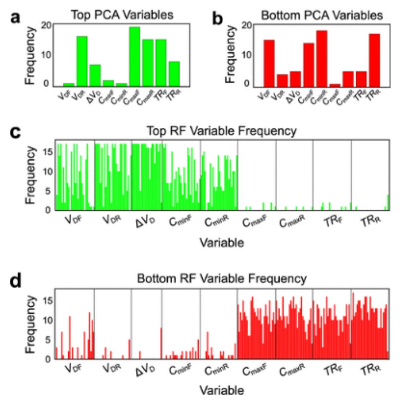 圖3.(a,b)33%的頂部(a)或底部(b)參數(shù)來自PCA預(yù)測值排名中的每個特征的頻率。前兩個主要成分的加權(quán)和用于對預(yù)測因子進(jìn)行排序。影響特征包括V