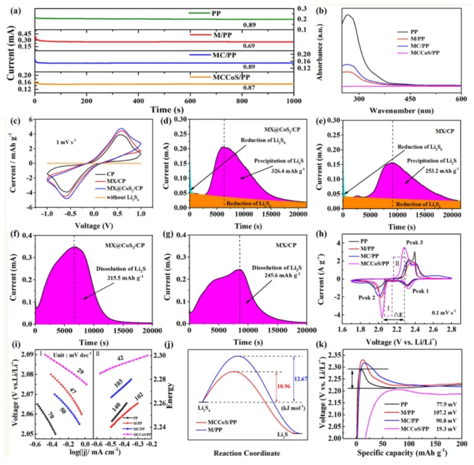 Figure 3. (a) 通過Li || Li對稱電池測試的PP、M/PP、MC/PP和MCCoS/PP隔膜的鋰離子遷移數(shù);(b) 電解槽右側(cè)液體的紫外-可見吸收光譜; (c) 使用CP、MX/CP和MX@CoS?/CP組裝的對稱電池的CV曲線; (d-e) Li?S的沉積曲線; (f-g) Li?S的溶解曲線; (h) CV曲線; (i)根據(jù)CV曲線的峰值2和峰值3計算的Tafel圖; (j) Li?S?還原的活化能(Ea); (k)基于不同隔膜的鋰硫電池充電曲線。