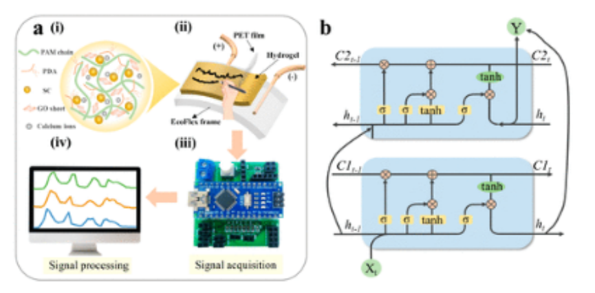 機器學習輔助手寫識別對于下一代生物識別技術的發展至關重要。然而,目前報道的大多數手寫識別系統都缺乏靈活的傳感和機器學習能力,這兩者都是智能系統實現所必需的。在此,在機器學習的幫助下,本研究開發了一種新的手寫識別系統,該系統既可以用作書面文本的識別器,也可以用作機密信息的加密器。這種靈活智能的手寫識別系統將印刷電路板與基于氧化石墨烯的水凝膠傳感器相結合。它提供快速響應和良好的靈敏度,并允許高精度識別從單個字母到單詞和簽名的手寫內容。通過分析從7名參與者獲得的690個手寫簽名,本研究成功地證明了快速的識別時間(小于1秒)和高識別率(∼91.30%)。我們開發的手寫識別系統在先進的人機交互、可穿戴通信設備、軟機器人操縱器和增強現實虛擬現實方面具有巨大潛力。