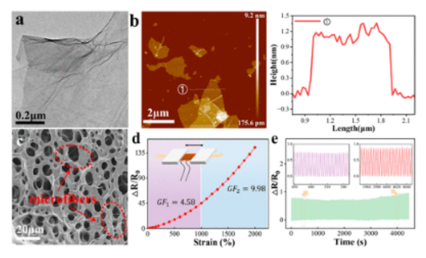 圖2.GO水凝膠的表征和性能:(a)GO納米片的TEM圖像和(b)AFM圖像;(c)GO水凝膠的掃描電子顯微鏡(SEM)形貌;(d) ΔR/R