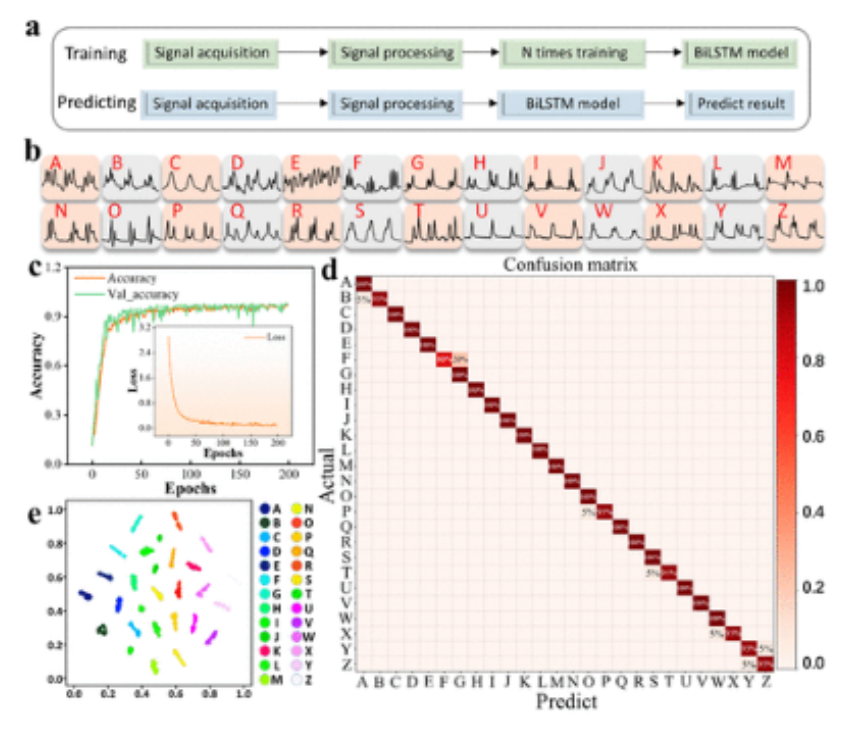 圖3.字母識別:(a)水凝膠手寫識別系統的數據處理流程,具有訓練和另一個實際識別過程;(b) 響應筆跡的阻力變化 26 個字母;(c) 識別26個字母的準確性和損失曲線;(d) 識別26個字母的混淆矩陣;(e) 使用t-SNE降維的數據集中2600個樣本的結果。