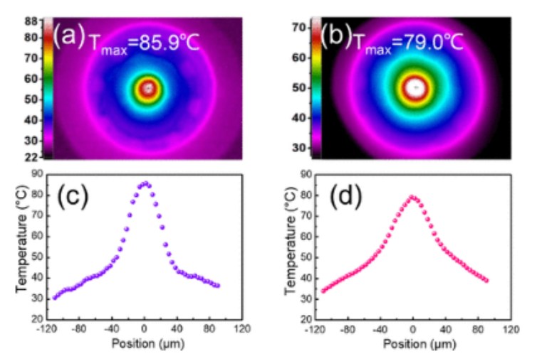 圖5.(a)PBONF和(b)FG40/PBONF的紅外熱圖像。(c) PBONF 和 (d) FG40/PBONF 沿 x 軸的溫度分布。