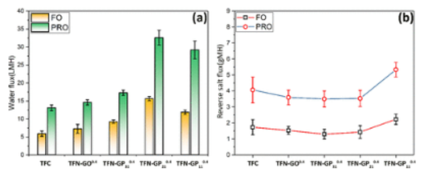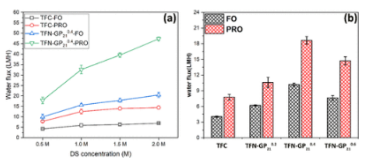圖8.(a) 水通量作為DS濃度的函數和(b)TFC和TFN-GP