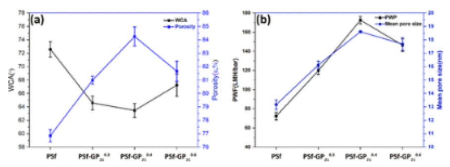 圖4.(a)WCA和孔隙率以及(b)作為納米填料濃度的納米復合基板的PWP和孔徑。