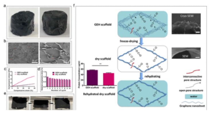 圖1. GEH和干腳手架的一般圖片和示意圖。(a) GEH和干燥腳手架的一般圖片;(b) GEH支架的冷凍SEM圖像,比例尺:50和10μm;(c)壓縮應力-應變曲線和(d)在生理鹽水中加載和卸載后GEH和干支架的多周期壓縮特性;(e) GEH支架在生理鹽水中反復壓縮后能保持彈性和原有結構;(f)GEH支架的冷凍SEM圖像和干燥支架的SEM圖像。GEH支架顯示出互連孔結構、開放孔結構、大表面積和中等氧含量。水凝膠支架比干支架能夠吸附更多的蛋白質。與GEH的關鍵區別在于,冷凍干燥后,形成GEH支架大孔結構的石墨烯納米片之間的水消失了,而原本分散在水中的石墨烯納片塌陷,導致大孔壁上的孔結構更加封閉。再水合后,水只能進入大孔,而不能進入坍塌的石墨烯納米片。比例尺:1μm。