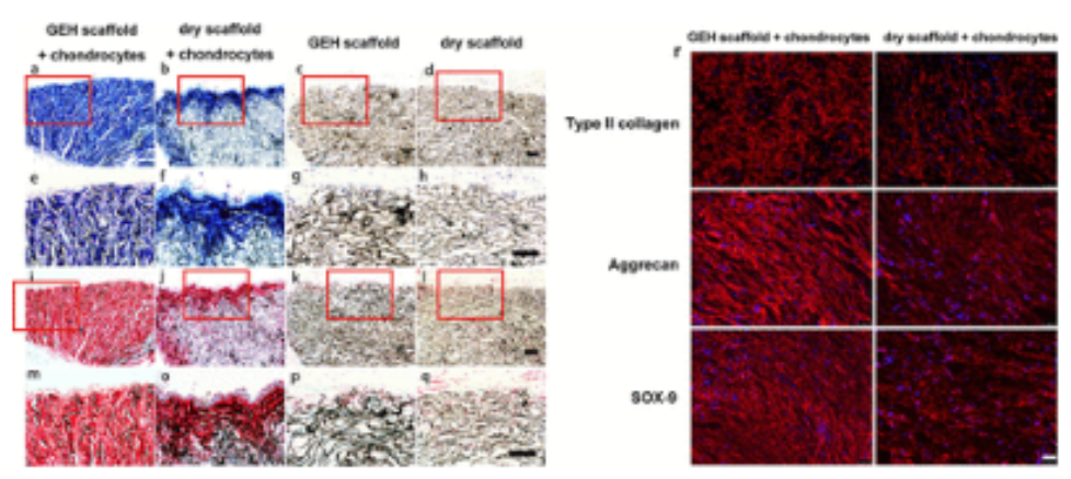 圖4:植入8周后,軟骨細胞接種的GEH和干支架的(a–h)甲苯胺藍和(i–q)紅花紅O/快綠組織學染色,無細胞支架作為對照(比例尺:50μm)。(e–h)分別對應于a–d中方框區域的高放大率圖像。(m–q)分別對應于i–l中方框區域的高放大率圖像。(r) 植入8周后接種軟骨細胞的GEH和干支架的II型膠原、聚集蛋白聚糖和SOX-9的免疫熒光染色。比例尺:50μm。