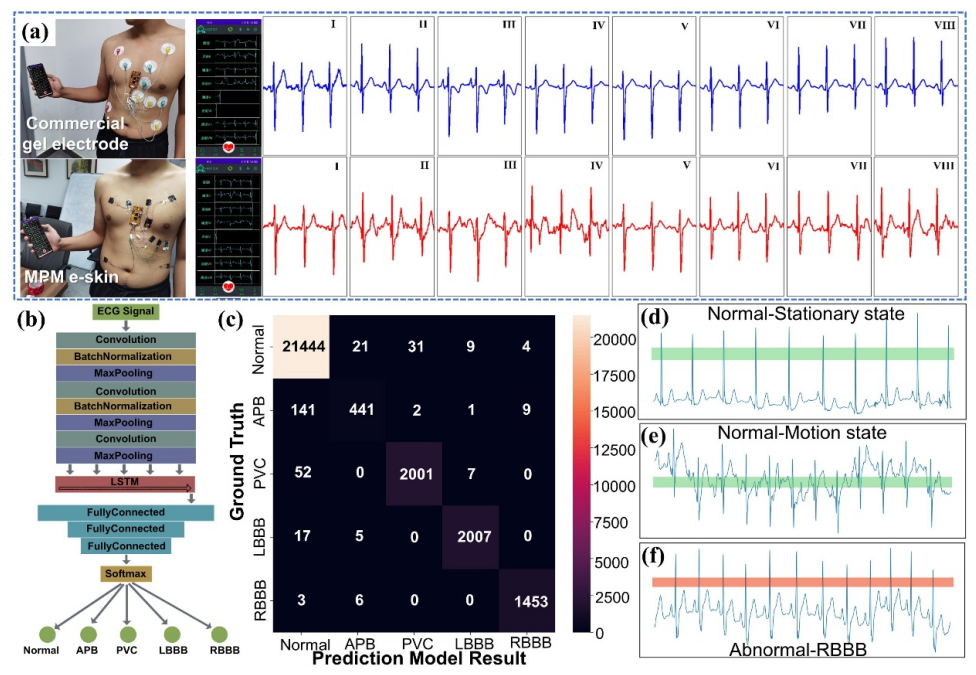 Figure 5. 智能心電系統測試結果。 (a)本系統使用商用凝膠電極(上圖)和MPM電子皮膚電極(下圖)采集12導聯(八通道)心電信號。 (b)將CNN&LSTM智能算法模型用于四種典型心律失常的分類診斷。 (c)混淆矩陣智能算法模型用于四類心律失常的診斷。 (d)采用MPM電子皮膚心電圖系統對靜止狀態的健康受試者進行正常診斷。 (e)采用MPM電子皮膚心電圖系統對運動狀態健康者進行正常診斷。 (f)通過MPM電子皮膚心電圖系統對一例RBBB患者進行異常診斷。