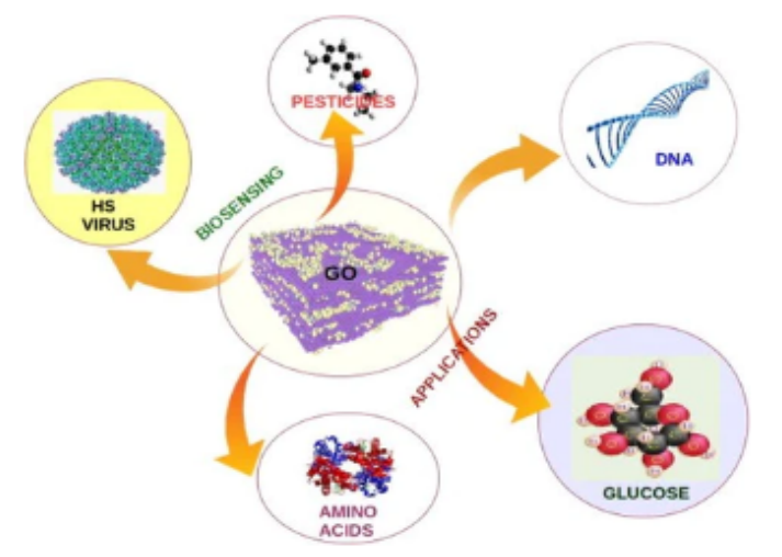 氧化石墨烯 (GO) 在生物傳感方面也有很大的應用潛力。例如,柏林弗勞恩霍夫研究所的科學家們修改了他們的 GO 傳感器以測試 COVID-19 抗體。在此之前,同一位研究人員表明,一滴血或唾液就足以在短短 15 分鐘內準確可靠地檢測出是否感染了其他疾病。疾病檢測由一個傳感器執行,該傳感器由放置在兩個電極之間的一片 GO 組成,用與特定生物標志物結合的分子功能化。氧化石墨烯在生物傳感方面有著悠久的應用歷史,包括抗體檢測、實時呼吸檢測、農藥篩選、DNA 傳感、HS 病毒檢測等。