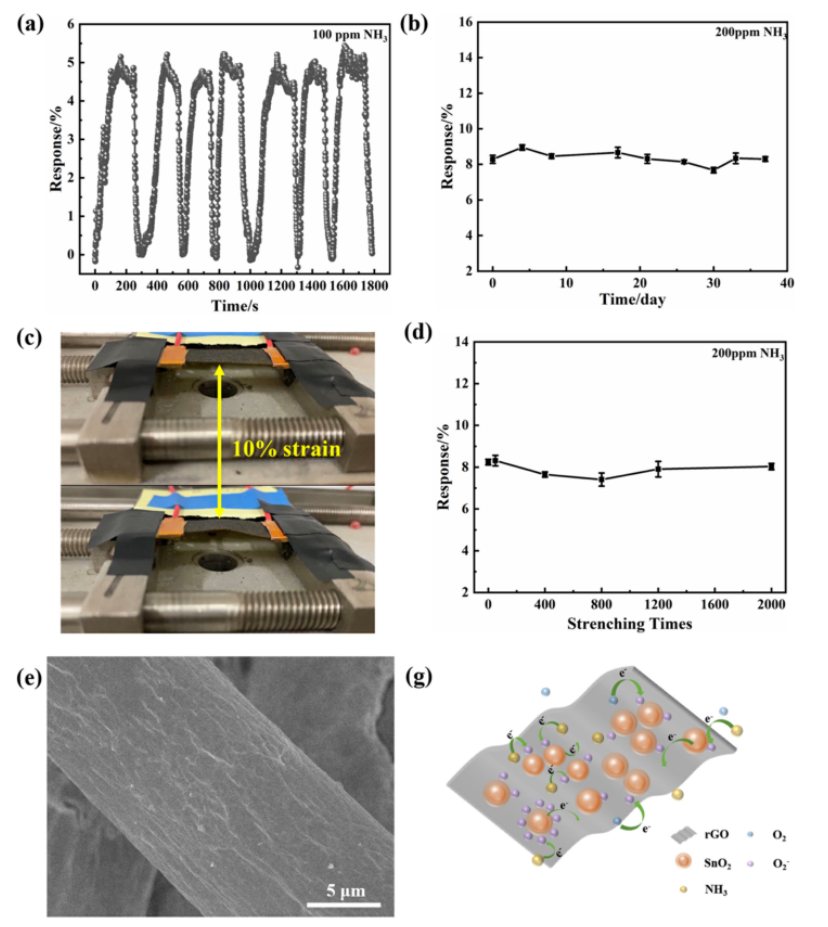 2/rGO的循環穩定性,(b) 36天的傳感器穩定性試驗,(c)拉伸試驗光學圖像,(d) 2000次拉伸(10%應變)傳感器穩定性,(e) 2000次拉伸后PI-SnO