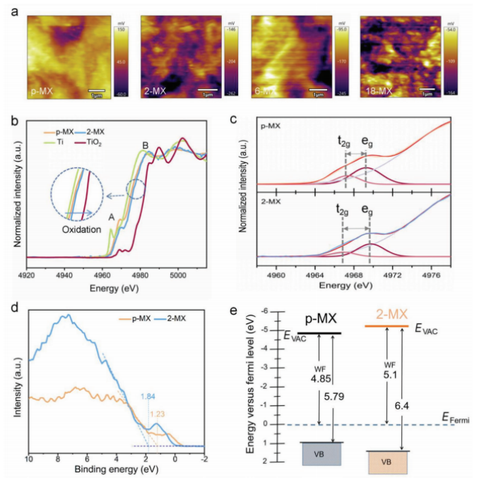 x MXenes的表面電子結構。通過開爾文探針力顯微鏡和同步輻射x射線吸收精細結構分析,發(fā)現(xiàn)采用普通水溶液的MXene基超級電容器的自放電率下降了20%。這種下降機制源于MXenes中羥基去除后功函數(shù)增加,導致零電荷電位升高。同時,強化的表面偶極子使得鎂烯與電解質之間的表面自由能更高。這兩種正效應賦予MXenes較弱的自放電動力學。具體來說,激活控制的自我放電過程被大大抑制。闡明電子結構與自放電伴隨的表面工程抑制策略之間的相關性,對高性能儲能器件的開發(fā)具有指導意義。