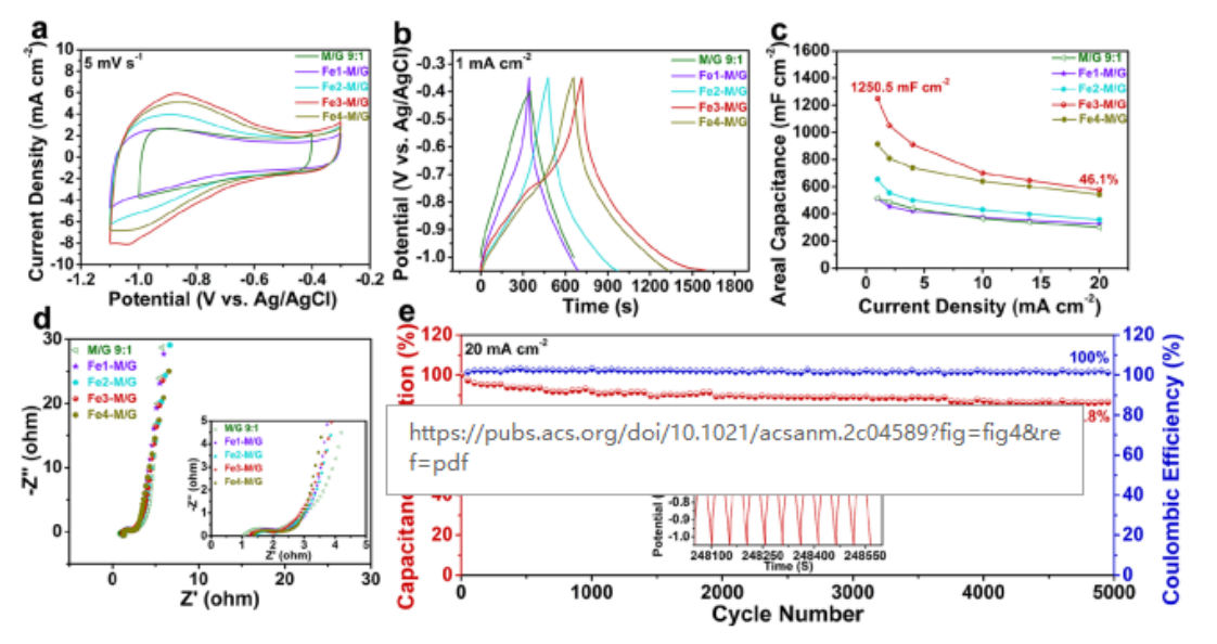 -2的GCD曲線;(c)由GCD曲線計算出的作為放電電流密度函數的面積容量;(d) M/G 9:1和FeM/G氣凝膠電極的Nyquist曲線;和(e) Fe3-M/G電極在20 A cm
