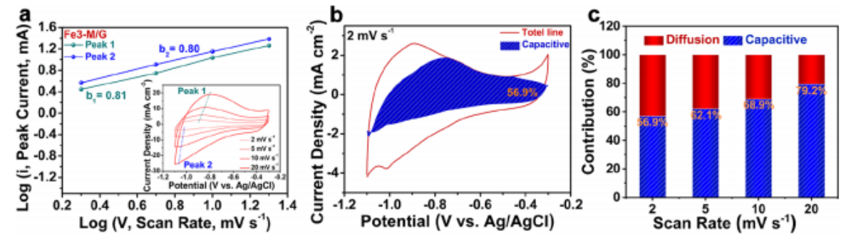 −1下的電容效應(藍色區域)和擴散控制(白色區域)效應。(c) Fe3-M/G電極在不同掃描速率下電容和擴散控制容量的歸一化貢獻比例。
