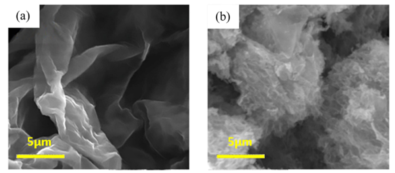 圖2. (a)石墨烯和(b) Ni@石墨烯表面形貌的SEM圖像。