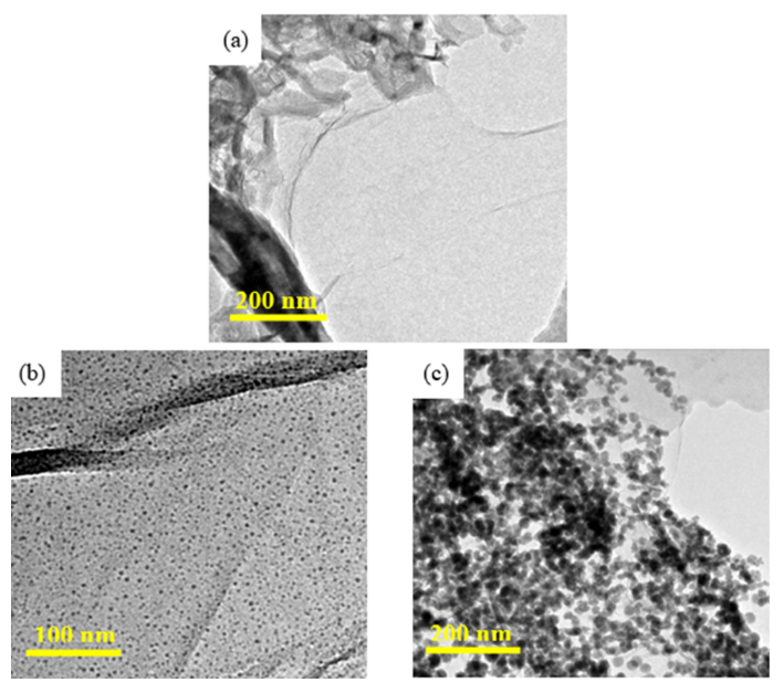 圖3. (a)石墨烯,(b) Cu@石墨烯, (c) Ni@石墨烯的TEM圖像。