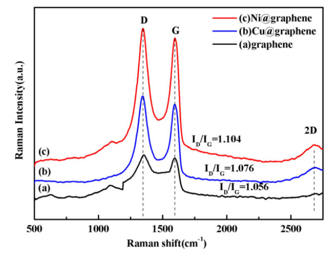 圖5. (a)石墨烯,(b) Cu@石墨烯, (c) Ni@石墨烯的拉曼光譜。