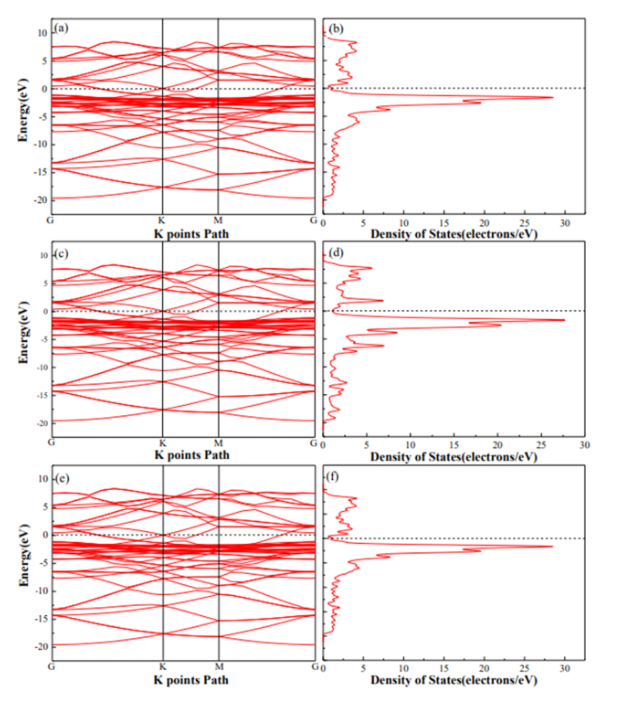 圖10. Cu(111)/石墨烯三種吸附模型的能帶結(jié)構(gòu)圖和態(tài)密度圖:(a,d)Top,(b,e)Hollow,(c,f)Bridge。