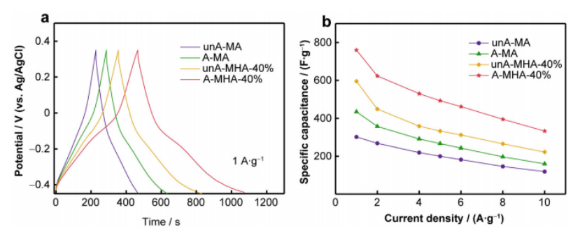 圖5 未對齊/雙向對齊的MXene氣凝膠和未對齊/雙向對齊的MXene雜化氣凝膠- 40%在1 Ag-1的GCD曲線;在1 Ag -1到10 Ag -1范圍內的電流密度下,從GCD分布計算b電容保持。