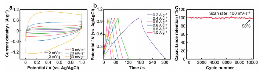 圖7 a - mha -40%//CNT海綿ASC裝置在不同掃描速率和電流密度下的a、b CV曲線和GCD曲線;c A-MHA-40%//CNT海綿ASC裝置的循環穩定性。