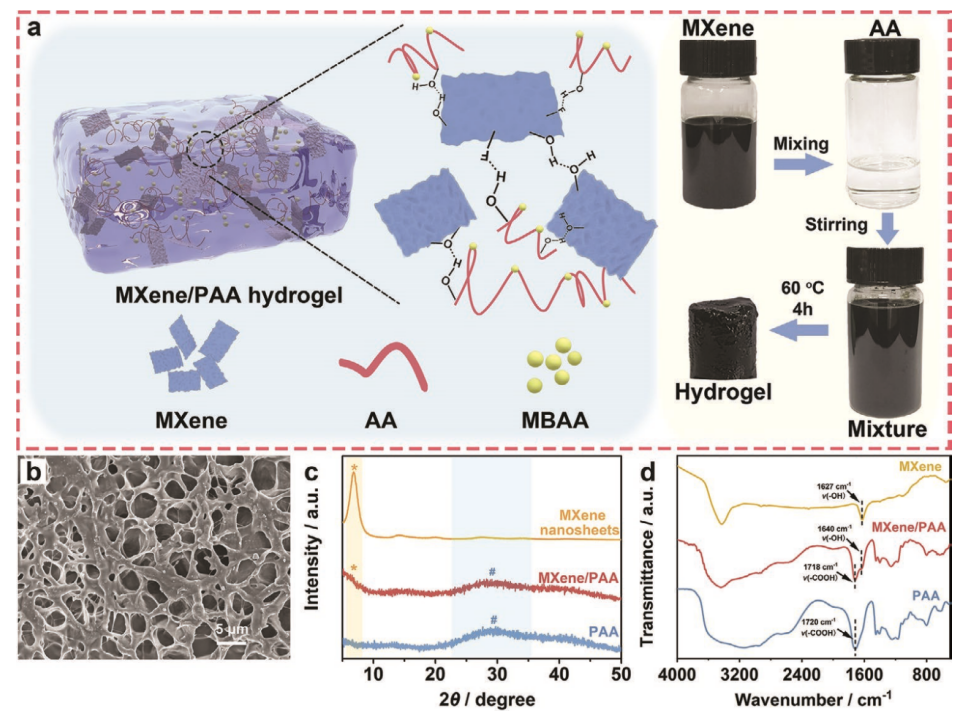 Figure 1. MXene/PAA 水凝膠的設計和表征。 a) 合成路線示意圖和 b) MXene/PAA 水凝膠的 SEM 圖像。 c) XRD 圖和 d) MXene 納米片、PAA 水凝膠和 MXene/PAA 水凝膠的 FT-IR 光譜。
