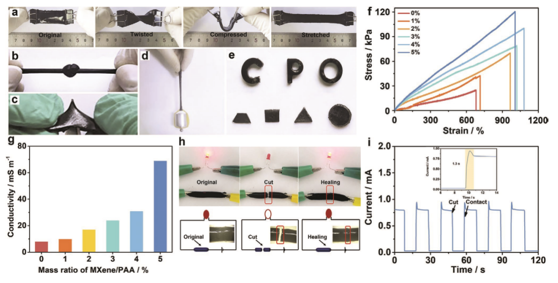 Figure 2. 水凝膠的性能研究。不同狀態下柔性 MXene/PAA 水凝膠的照片。原始狀態、扭曲狀態、壓縮狀態和拉伸狀態 a)、打結后拉伸 b)、承受剪刀的銳利壓力 c)、舉起 200 克重物 d)、可塑性 e)。具有不同MXene質量比的MXene/PAA水凝膠的應力-應變曲線f)和電導率g)。 h) 不同 MXene/PAA 水凝膠狀態(即原始、切割和愈合)下 LED 亮度變化的照片以及相應的電路圖示意圖。 i) MXene/PAA水凝膠自修復前后的電流變化曲線。