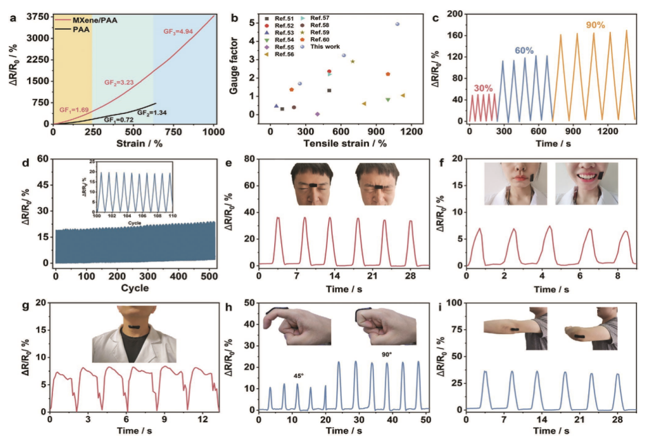 Figure 5. MXene/PAA水凝膠的傳感性能。 a) MXene/PAA 水凝膠和 PAA水凝膠的相對電阻-拉伸應變曲線。 b) MXene/PAA 水凝膠與文獻中發表的其他水凝膠材料之間拉伸 GF 的比較。 c) 不同應變下的相對電阻變化(即 30%、60% 和 90%)。 (d) 應變為 30% 時,染色傳感器在 5000 秒內的相對電阻穩定性。 MXene/PAA 水凝膠傳感器的應用。實時記錄眉毛e)、嘴巴f)、喉嚨g)、手指h)、肘部i)各種人體活動產生的相對電阻變化。
