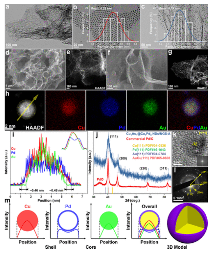Figure 1. (a)NGS、(b)Cu1Au1@Cu1Pd3NDs和(c)Cu1Au1@Cu1Pd3NDs/NGS-A的TEM圖像。相關(guān)的粒徑分布直方圖顯示在插圖中。(d,e)NGS和(f,g)Cu1Au1@Cu1Pd3NDs/NGS-A的SEM和HAADF-STEM圖像。(h)Cu1Au1@Cu1Pd3ND-A的STEM-EDS圖譜結(jié)果。(i)相關(guān)的STEM-EDS線掃描結(jié)果。插圖顯示了相關(guān)的信號強(qiáng)度擬合曲線。(j)XRD圖。(k)HR-TEM圖像和(l)Cu1Au1@Cu1Pd3NDs-A的SAED圖。HR-TEM圖像中的插圖是相關(guān)的FFT模式。(m)Cu1Au1核和Cu1Pd3殼的納米結(jié)構(gòu)示意圖。