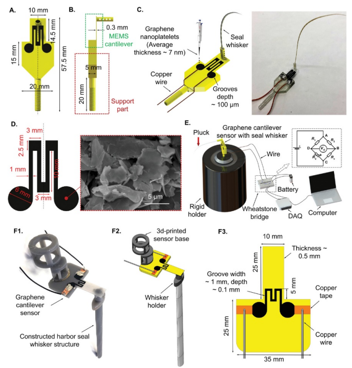 Fig 2. 懸臂式石墨烯傳感器。 A,B) 用于測(cè)量固有頻率的懸臂結(jié)構(gòu)傳感器尺寸(縱橫比≈50,厚度≈0.3 mm)。 C) 墨滴鑄造中的導(dǎo)電石墨烯納米片 (GNP) 和帶有胡須的懸臂梁傳感器原型。D) GNP 染色規(guī)的尺寸和微通道中石墨烯納米片的掃描電子 (SE) 顯微照片(深度≈100 µm)。 E) 顯示基于懸臂傳感器的自然頻率測(cè)量的實(shí)驗(yàn)裝置的示意圖。用于胡須的 WIV 和 VIV 測(cè)量的石墨烯懸臂傳感器的 F1) 原型和 F2) CAD 模型。使用熱熔膠將 3D 打印傳感器連接到 3D 打印傳感器底座。接下來(lái),將 3D 打印的胡須結(jié)構(gòu)插入 3D 打印的胡須支架中,該胡須支架連接到 3D 打印傳感器的末端。 F3) 懸臂傳感器的尺寸。