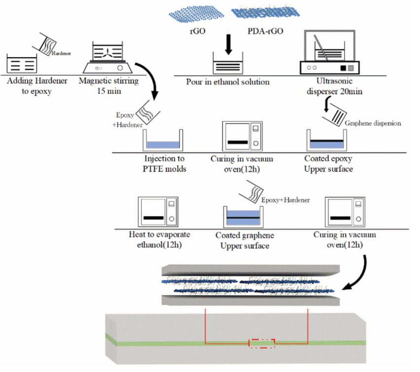Fig 2. 具有 PDA-rGO/rGO 芯層的夾層復合材料的制備過程。