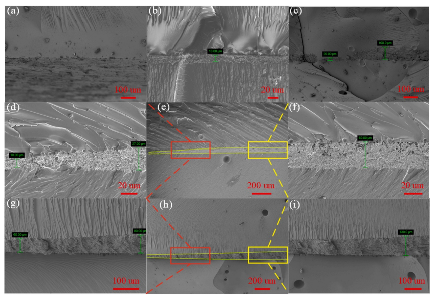Fig 8. 具有 (a) 無芯層、(b) 0.25 wt‰ rGO 芯、(c) 1 wt‰ rGO 芯、(e) 0.5 wt‰ rGO 芯和 (h) 0.75 wt‰ rGO 芯的夾層復合材料的斷裂表面 SEM 圖像和放大圖 (d)、(f)、(g)、(i) SEM 圖像中相應的紅色和黃色框區域。