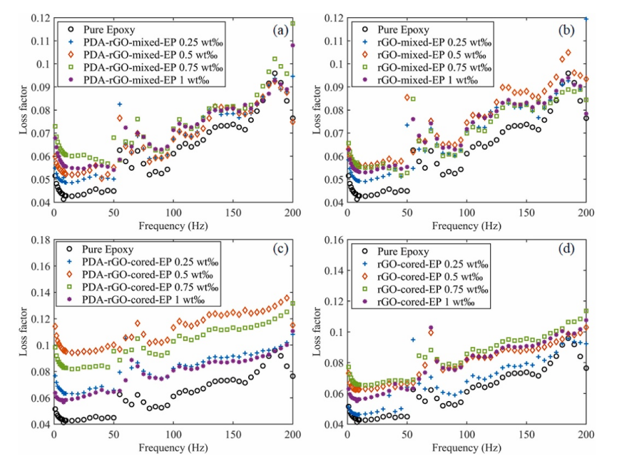 盡管大量研究證實添加石墨烯可以改善聚合物復合材料的阻尼性能,但迄今為止,一些關鍵問題,包括石墨烯的聚集和表面摩擦力,仍未得到改善。在這項研究中,設計和制備了受自然啟發的三明治復合材料用于振動抑制,同時還制備了傳統的共混復合材料和純環氧樹脂試樣作為參考。動態力學分析和振動測試結果證實,夾層復合材料的阻尼性能優于共混復合材料和純環氧樹脂,其中純環氧樹脂的損耗因子為 0.067,而傳統共混和夾層復合材料的質量分數為0.75 wt‰,分別增加到0.067和0.0942。然后提出了競爭行為的能量耗散機制來解釋夾層復合材料的鐘形阻尼隨芯層厚度的增加而變化。此外,聚多巴胺(PDA)用于修飾還原氧化石墨烯(rGO)以增大表面摩擦力,從而提高了rGO的阻尼增強能力。具體而言,質量分數為0.5 wt‰的PDA改性rGO增強復合材料的阻尼比比相同質量分數的rGO增強復合材料高42.2%。rGO的改性和三明治復合材料的成功制備為振動能量耗散和阻尼增強提供了一種新的策略。