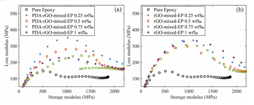 Fig 14. (a) PDA-rGO-cored-EP、(b) rGO-cored-EP、(c) PDA-rGO-mixed-EP 和(d) rGO-mixed-EP 的損耗模量隨溫度在 1Hz 下的變化。
