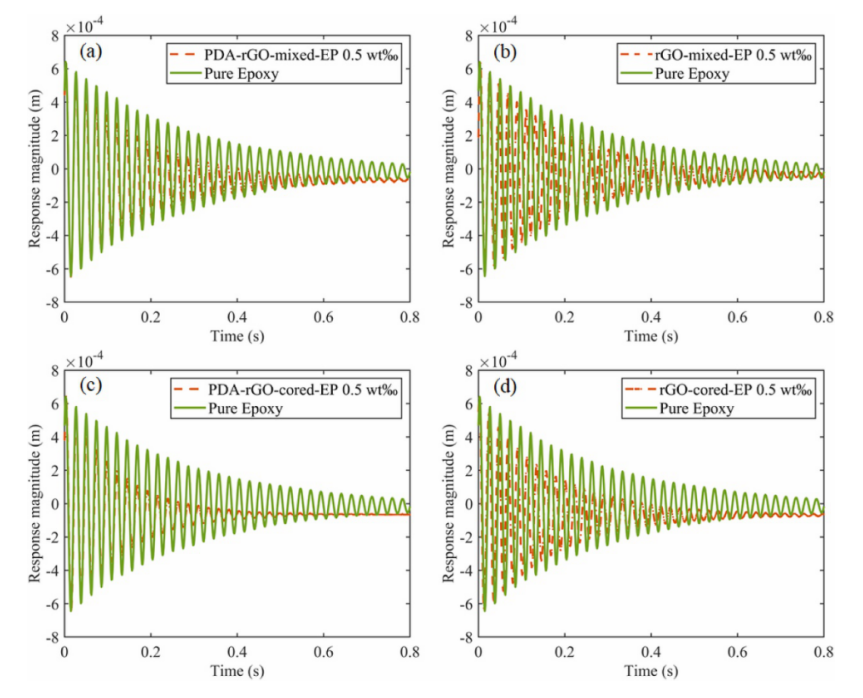 Fig 17. 環氧樹脂與質量分數為 0.5 wt‰ 的復合材料的振動衰減曲線比較:(a) PDA-rGO-mixed-EP,(b) rGO-mixed-EP,(c) PDA-rGO-cored-EP 和 ( d) rGO-cored-EP。