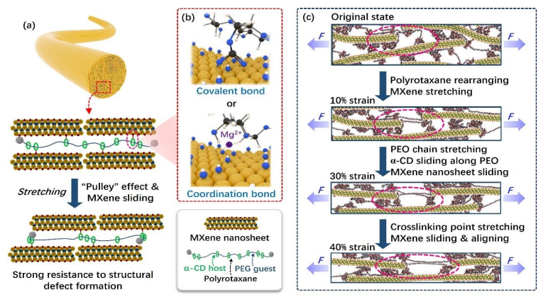 Fig 1. cMP 纖維的示意圖和 MD 模擬。 (a) 機械互鎖結構的功能示意圖,允許 PEG 主鏈拉伸,α-CD 環在聚輪烷中沿 PEG 主鏈滑動,以及 MXene 納米片在拉伸應變下沿軸向相互滑動。 (b) 機械互鎖結構中 MXene 納米片和 α-CD 環之間形成的共價鍵和配位鍵的交聯點。 (c) 由機械互鎖結構實現的不同應變狀態下 cMP 纖維結構穩健機制的 MD 模擬。