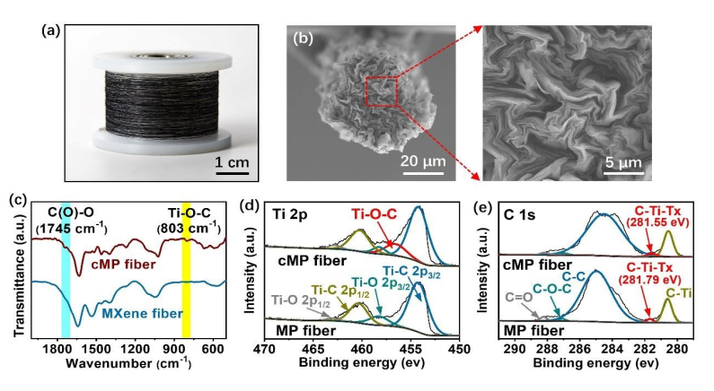 Fig 2. cMP 纖維的表征。 (a) 纏繞在鼓上的一米長 cMP 纖維的照片。 (b) cMP 纖維脆性斷面的 SEM 圖像。 (c) 純 MXene 和 cMP 纖維的 FT-IR 光譜比較。 (d) Ti 2p 區域和 (e) C 1s 區域中的 cMP 和 MP 纖維的 XPS 光譜。