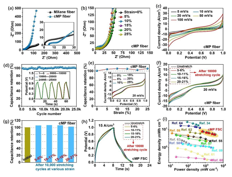 Fig 6. cMP 纖維和基于 cMP 纖維的超級電容器的穩健電化學性能。 (a) cMP 和純 MXene 纖維的電化學阻抗譜 (EIS) 數據。 (b) cMP 纖維在各種應變下的初始和拉伸狀態下的電化學阻抗譜 (EIS) 數據。 (c) cMP 纖維電極的循環伏安法 (CV) 曲線(從 5 到 100 mV/s)。 (d) cMP 纖維電極循環過程中的電容保持率。插圖顯示了 cMP 纖維電極的第 1-5、9995-10000、19995-20000 和 24995-25000 循環。 (e) cMP 纖維電極的電容保持率與拉伸應變的關系。插圖顯示了 cMP 纖維電極在各種應變下處于初始和拉伸狀態時 20 mV/s 的 CV 曲線。 (f) cMP 纖維電極在初始狀態下和 10,000 次拉伸循環后分別在 5–6%、10–11%、15–16% 和 20–21% 的應變之間的 CV 曲線為 20 mV/s。 (g) 在分別為 5–6%、10–11%、15–16% 和 20–21% 的應變之間進行 10000 次拉伸循環后,cMP 纖維電極的電容保持率。 (h) cMP 纖維的恒電流充電/放電曲線(15 A/cm3)在應變分別為 5–6%、10–11%、15–16% 和 20–21% 之間進行 10000 次拉伸循環后的電極。 (i) cMP FSC 在初始狀態和 10000 次拉伸循環后的體積能量密度和功率密度分別為 5-6%、10-11%、15-16% 和 20-21%,與最先進的基于纖維的超級電容器。