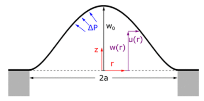 圖1.充氣軸對稱膜的橫截面示意圖和膜上的壓差。
