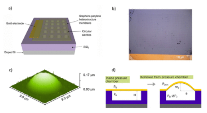 圖2. 傳感器設計和微泡膨脹測試。(a) GPH膜電容式壓力傳感器的3D示意圖。(b) 用于測量電容壓力響應的GPH膜電容壓力傳感器的光學顯微照片,包括金電極、GPH膜和空腔。(c) 膨脹泡罩的3D地形原子力顯微鏡(AFM)圖像,半徑a=3.5μm,厚度t=45 nm,壓力ΔP=0.94 kPa。(d)2D示意橫截面圖,描繪了具有單個空腔和致動膜的微泡膨脹測試程序,標記了重要參數。